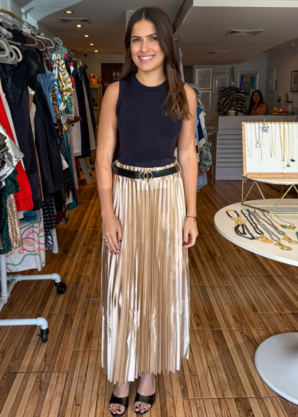 Champagne pleated maxi skirt with elastic waist band and black belt with gold broche. Elegant and timeless. Pairs well with any top. Perfect for the Holiday season.