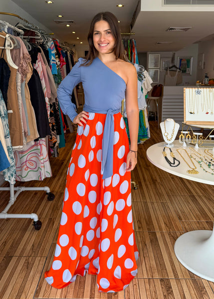 One shoulder maxi dress. Steel blue top with orange and baby blue polkadot bottom. Comes with an optional self tie at the waist.