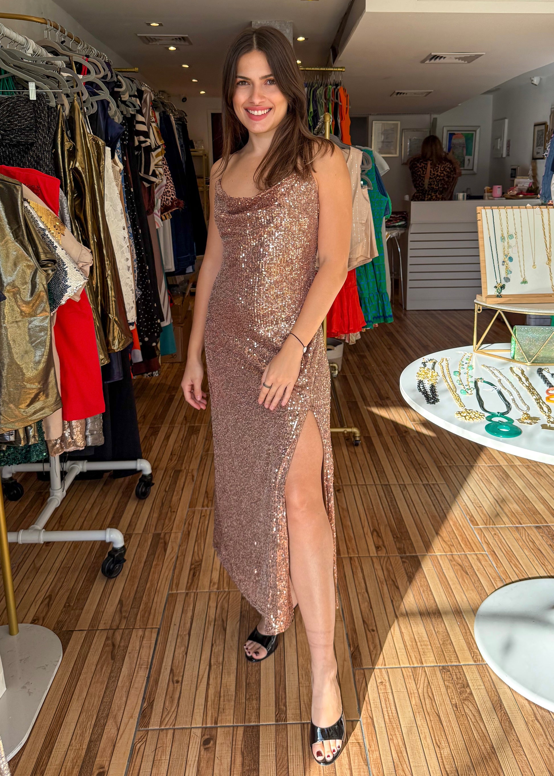 Latte sequin cowl neck slit midi dress. Beautiful crossed back with adjustable straps. Line with invisible zipper.