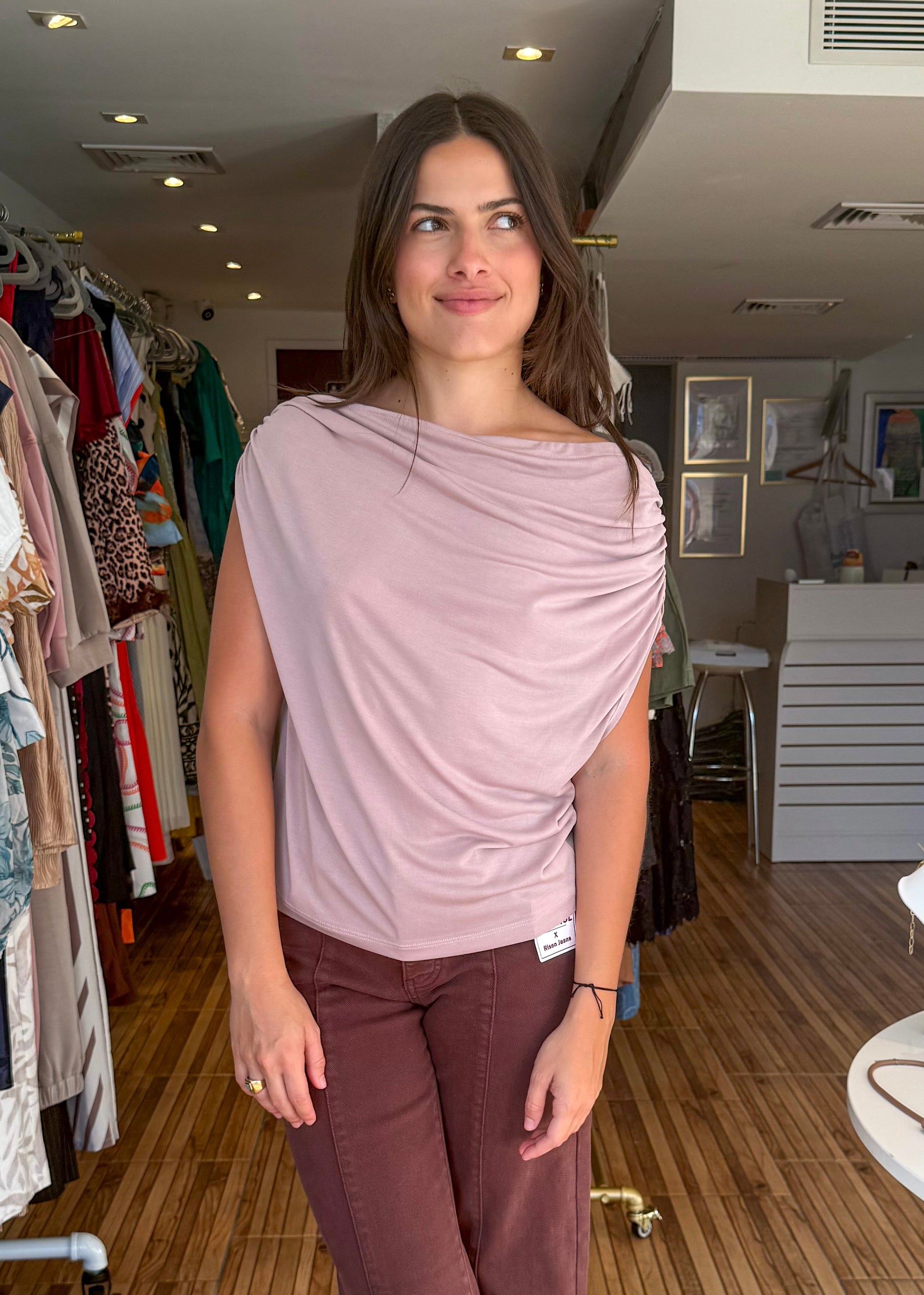 Mauve draped top. Soft fabric. Can we worn off the shoulder. Perfect top with any jeans or shorts.