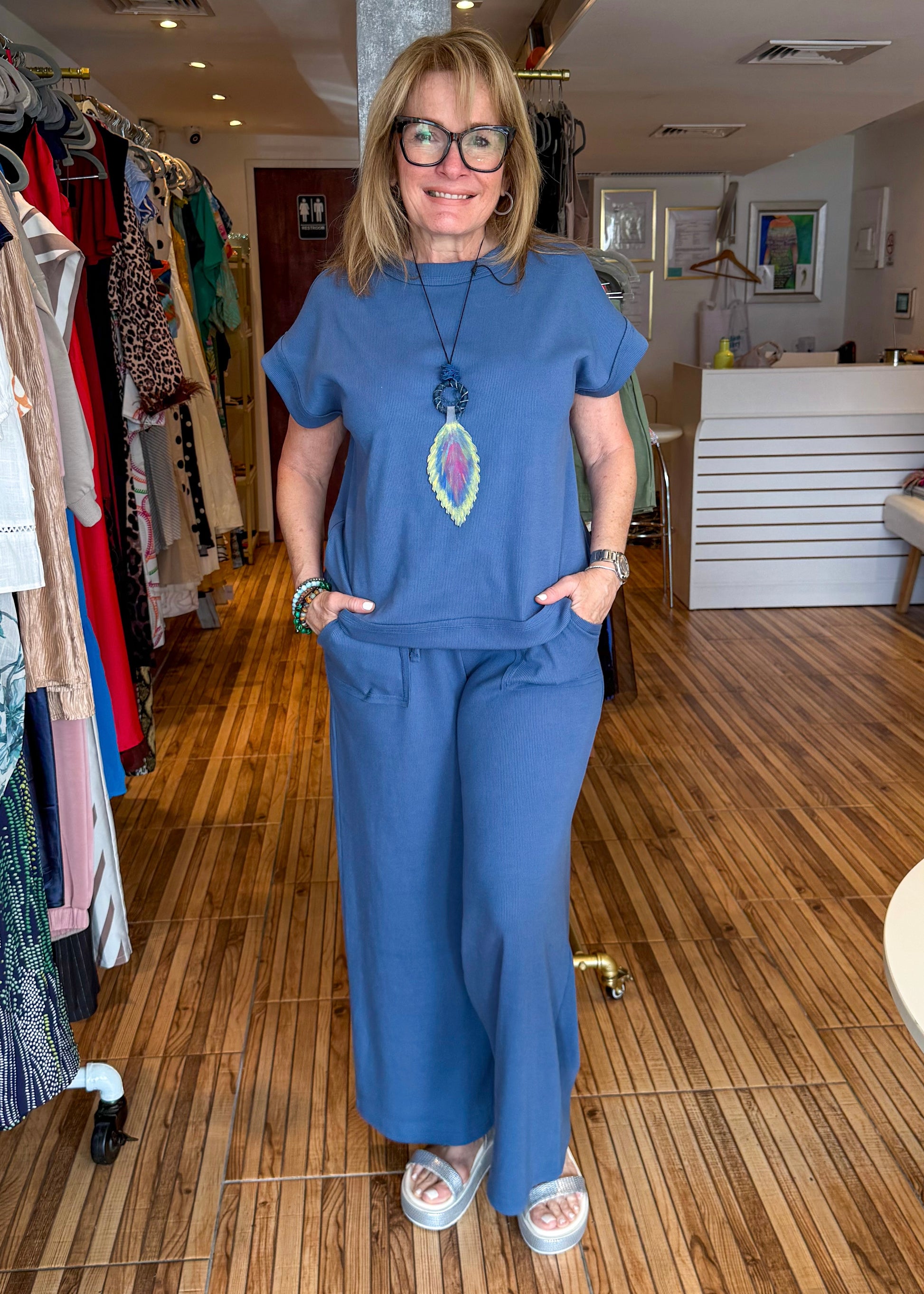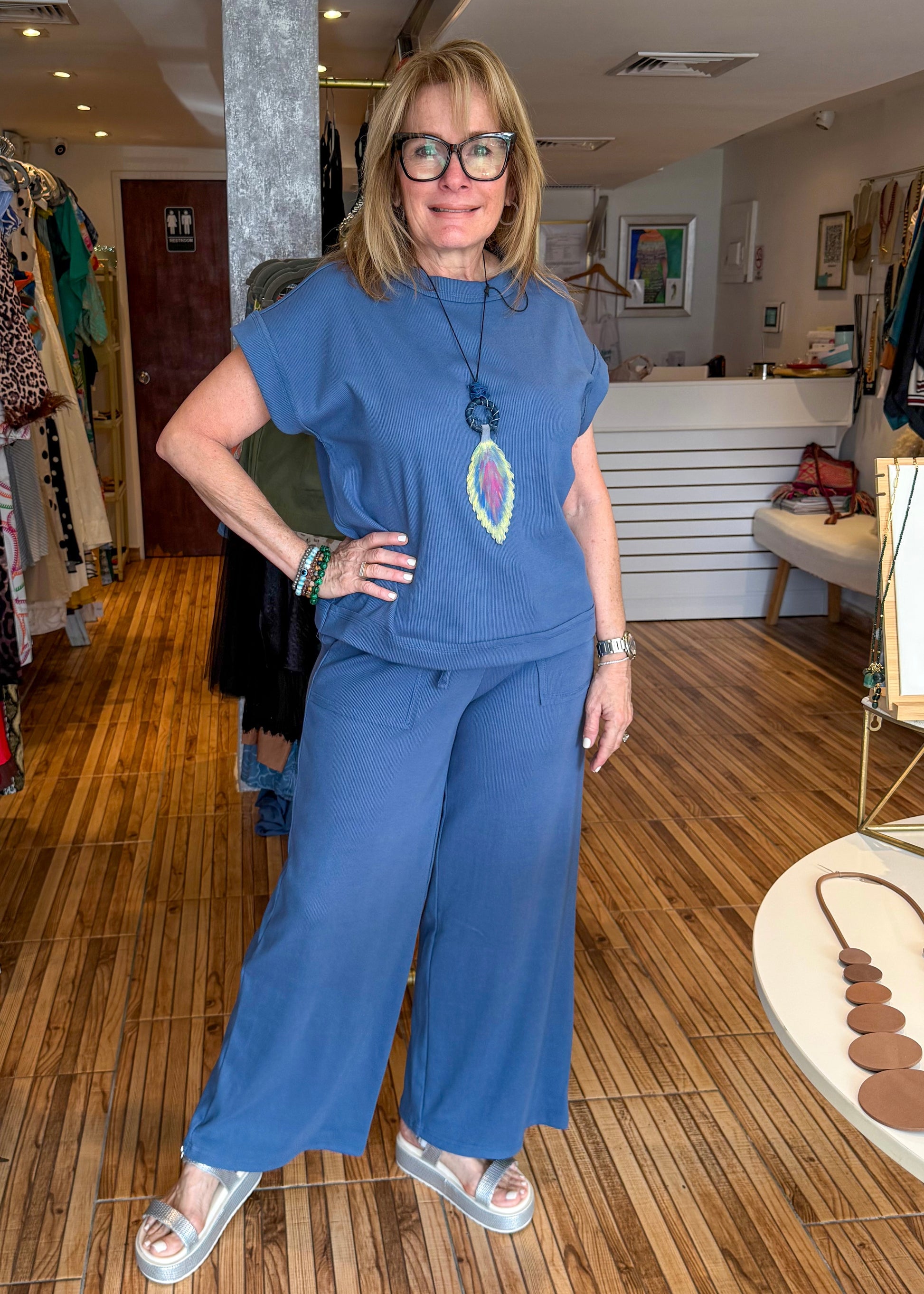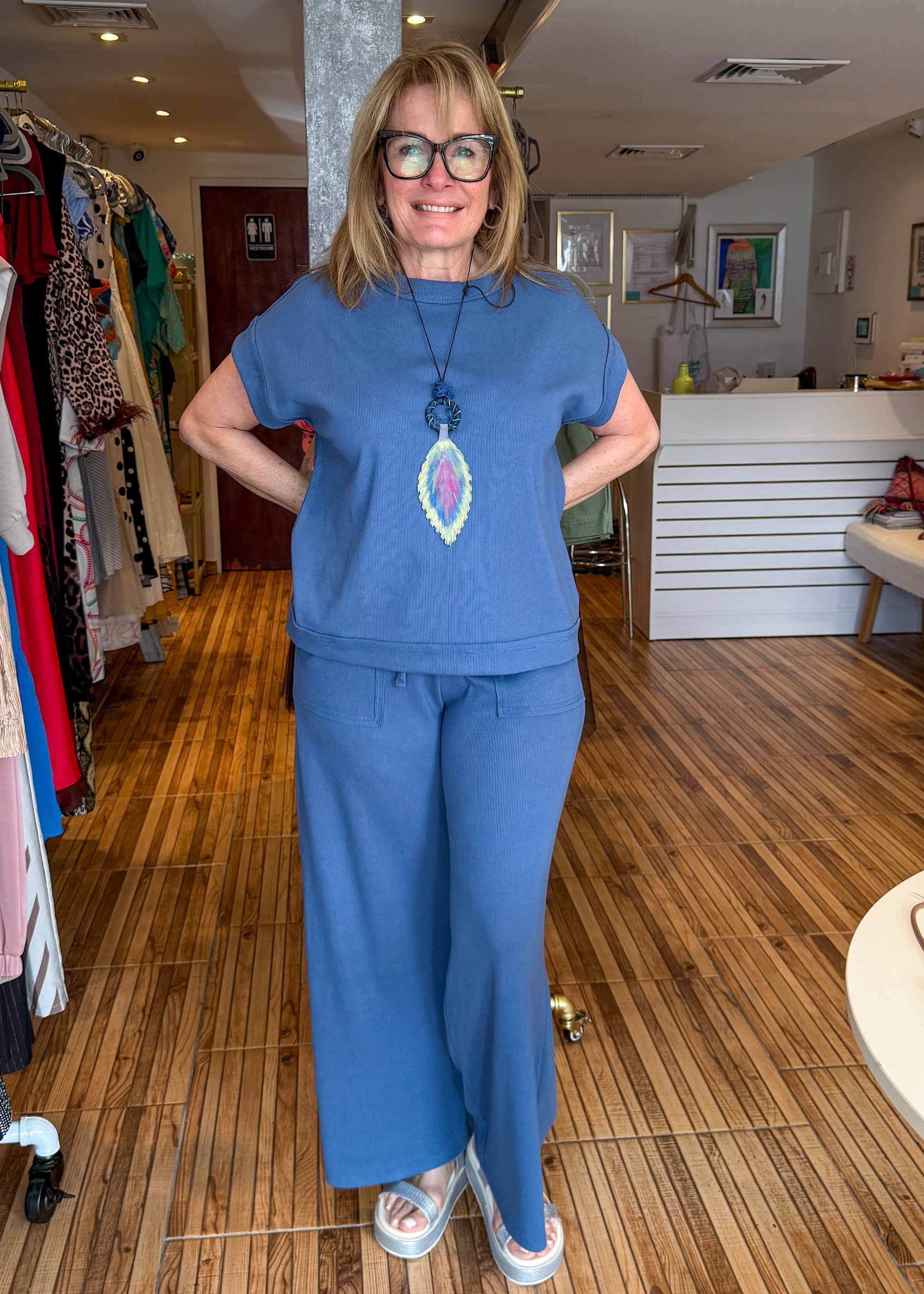 The perfect travel set! Blue short sleeve top with matching elastic waist band front pocket pants. Soft and cosy perfect for traveling or a comfortable day in or out.