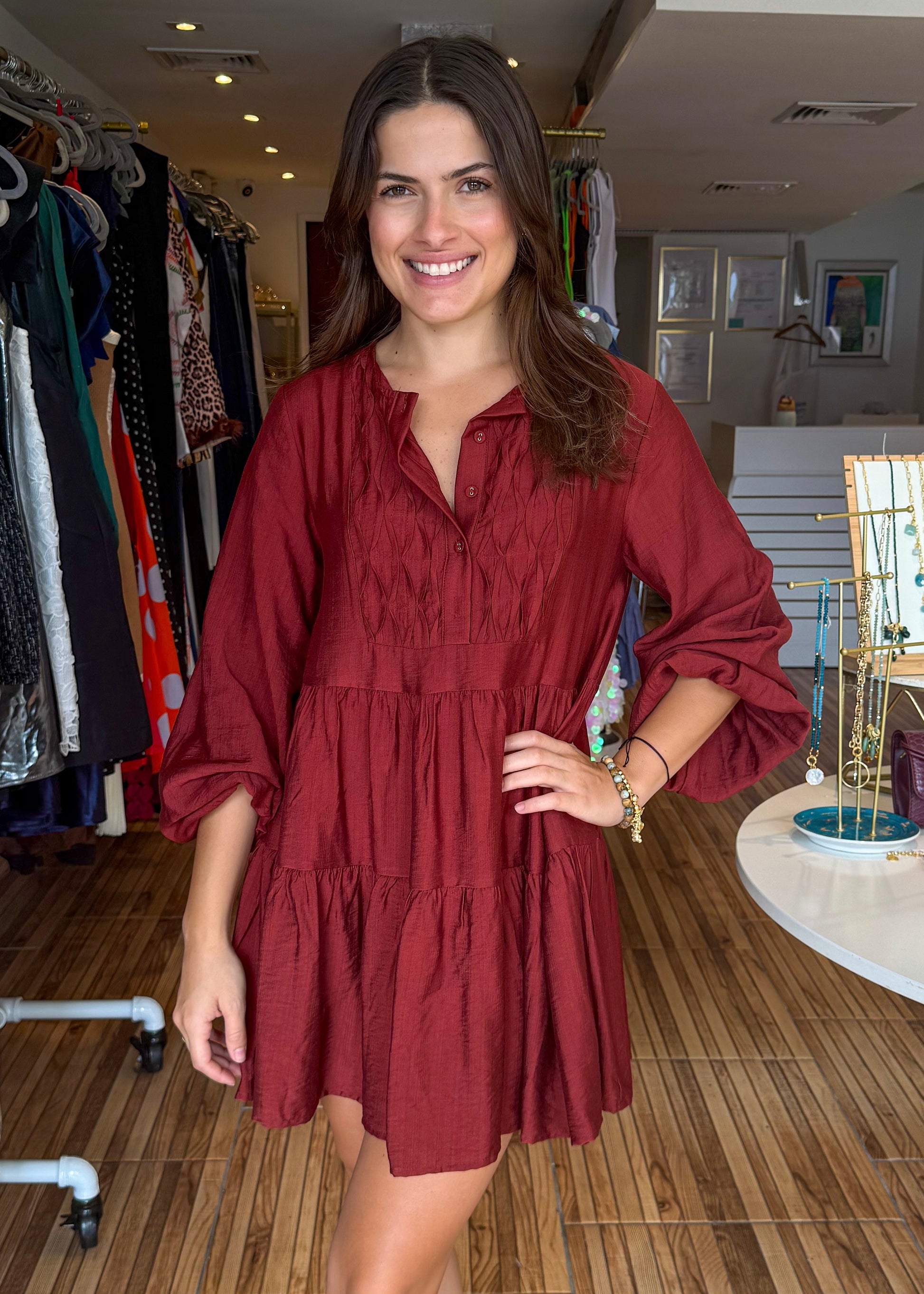 Burgundy loose fit woven short dress. Long sleeves with elastic arm band, sleeves can be ballooned and made shorter. Dress is flowy and fresh. Perfect with sneakers and flats.